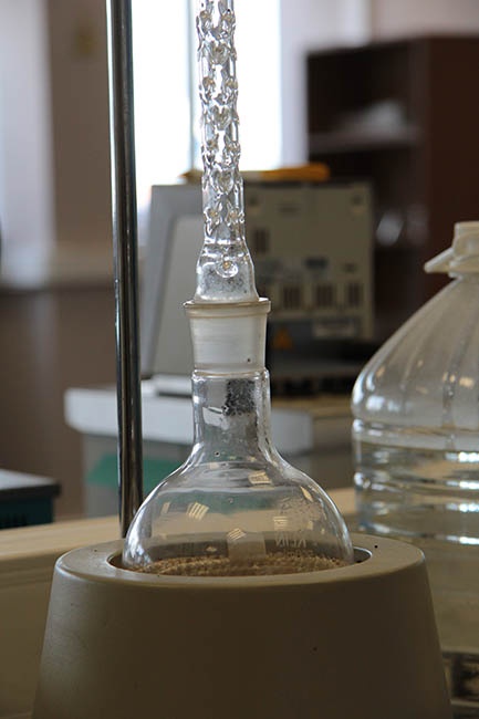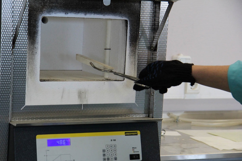 Данный тест предназначен для определения фактического количество наполнителя в готовом битумно-полимерном компаунде. В жаростойкую кювету помещается образец компаунда, взятый с линии, и ставится в муфельную печь. При определенной температуре битум и полимерные модификаторы выгорают, оставляя в кювете лишь доломитовую муку, которая не подвержена выгоранию.