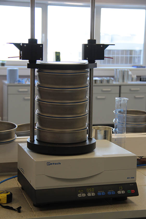 Проверяется с помощью системы сит на вибрационном столе. В верхнее сито засыпаются образцы гранулята, которые вследствие вибрации постепенно просыпаются через сита разных диаметров от большего к меньшему. Взвешиванием на весах получившихся в результате просеивания образцов определяется процентное соотношение разных фракций