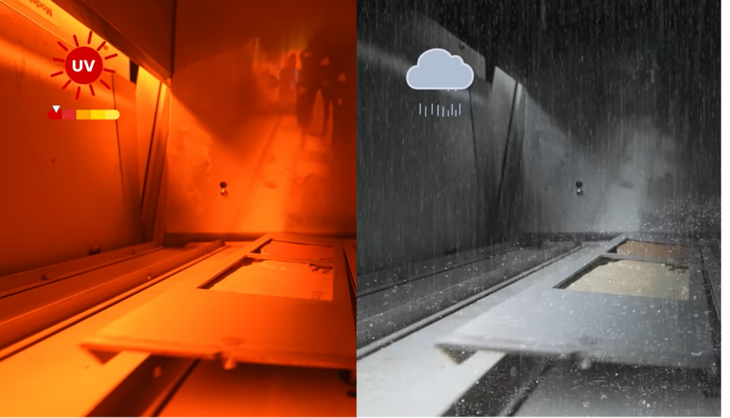 · испытание на светостойкость. Стабильность цвета фасадного материала — одна из главных характеристик его качества, поэтому при тестировании создаются максимально жесткие условия, имитирующие самые жаркие летние дни с периодическими обильными дождями. Образцы сайдинга помещаются в специальную установку на 1000 часов (почти 42 дня), фасадных панелей — на 2000 часов (84 дня). В течение всего этого времени в камере поддерживается высокая температура, а образцы попеременно облучаются ультрафиолетом и обильно смачиваются водой.