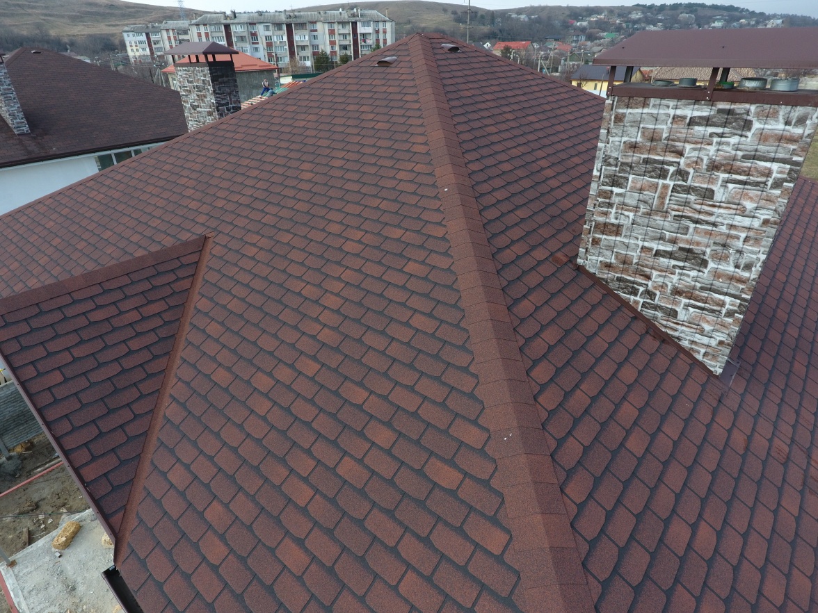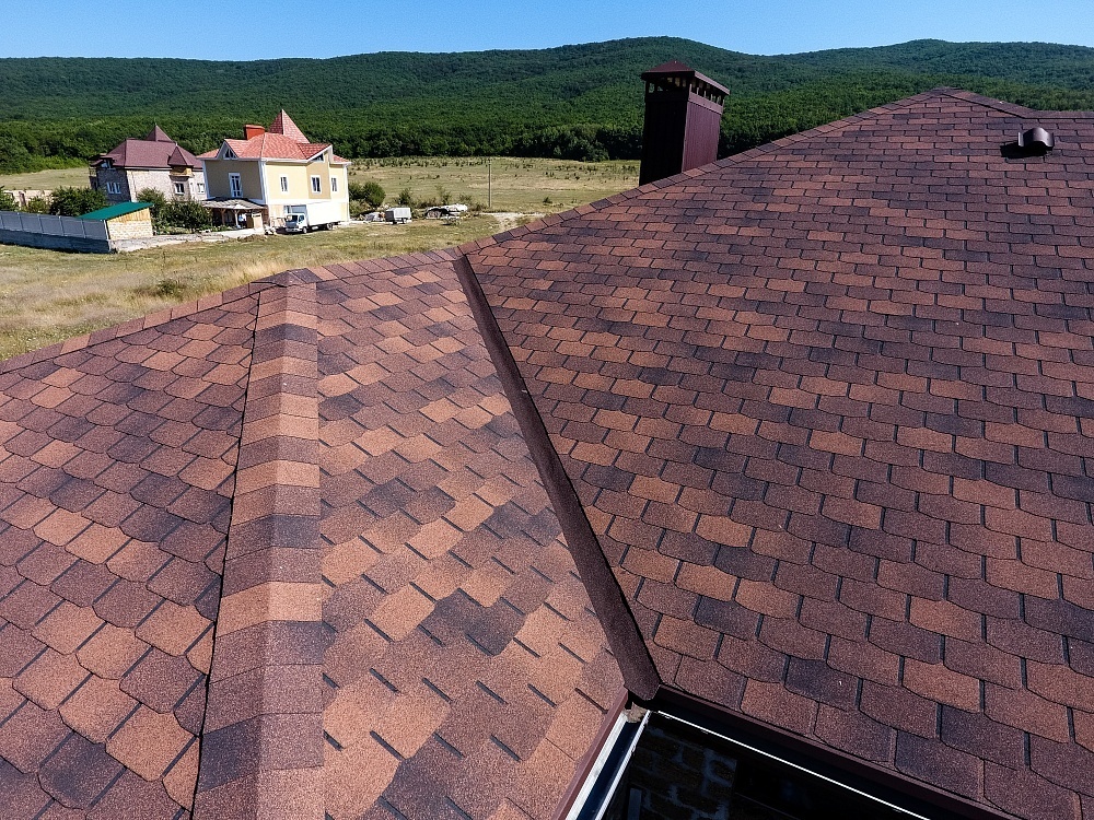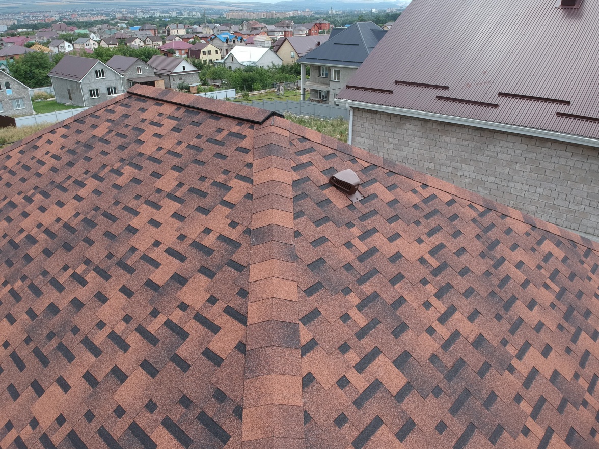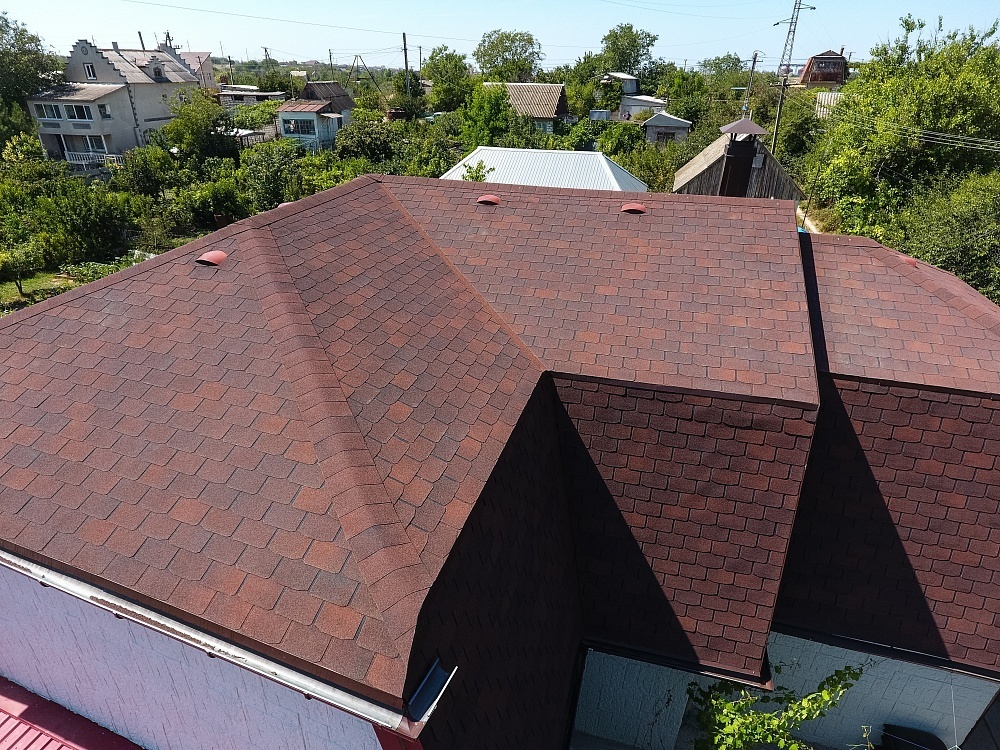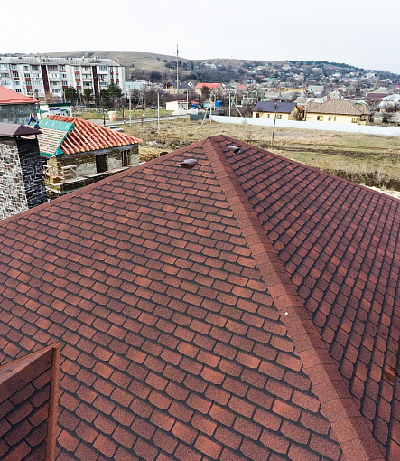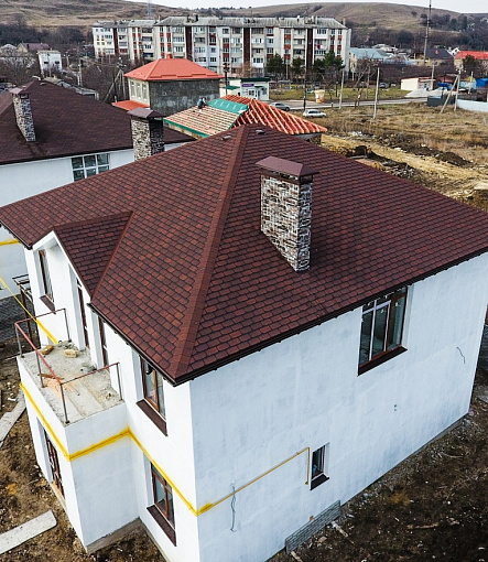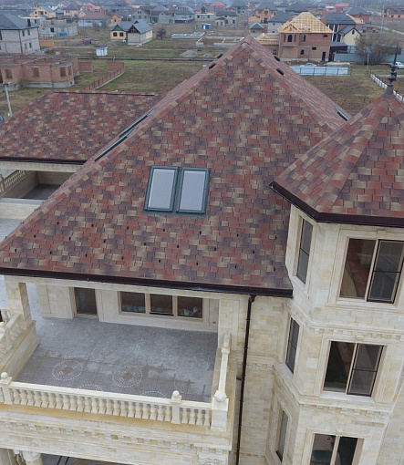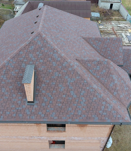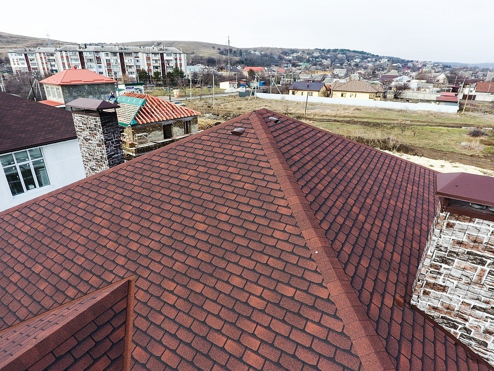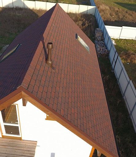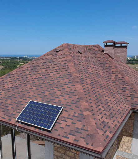 Комбинация гонтов гибкой черепицы серии PREMIUM из коллекции ЖЕНЕВА, цветов Изюм и Чили