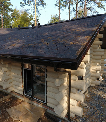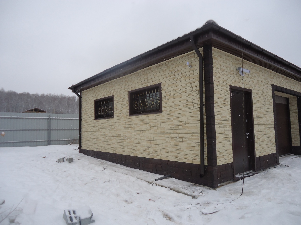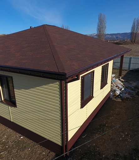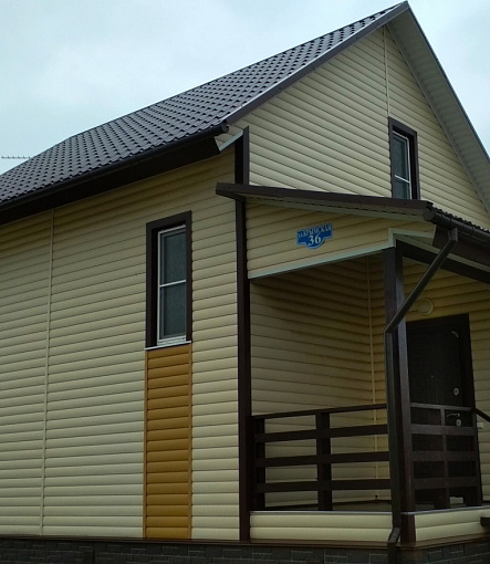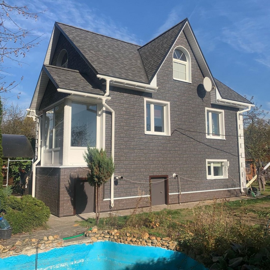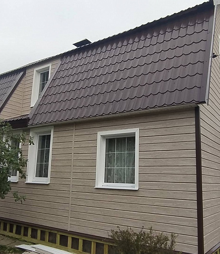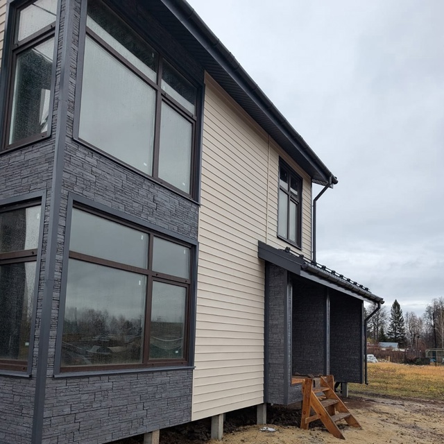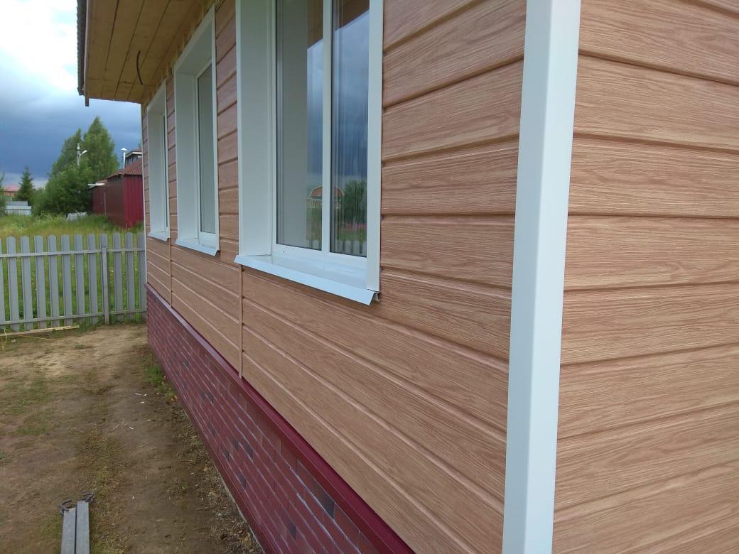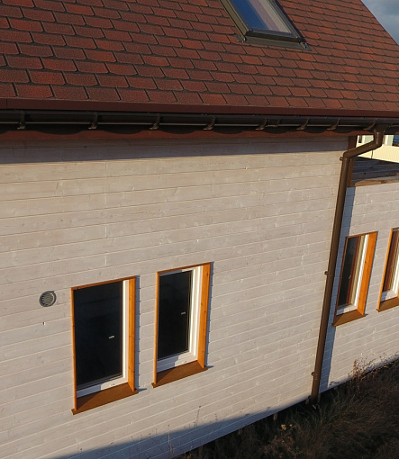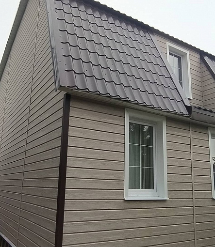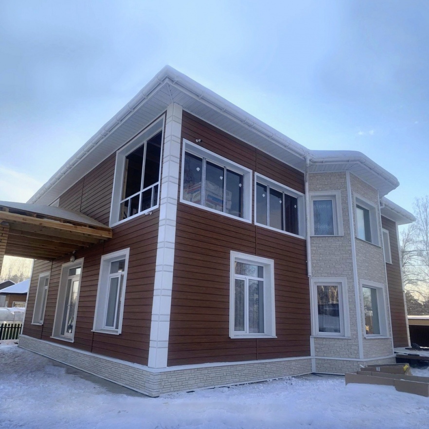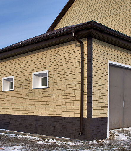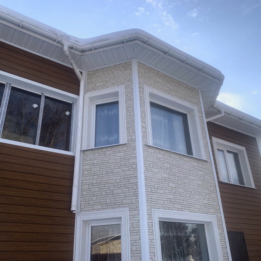 Сайдинг LUX Блок-хаус D4.7T Кедр, Фасадные панели Stein Темный орех, Водосток LUX Пломбир
