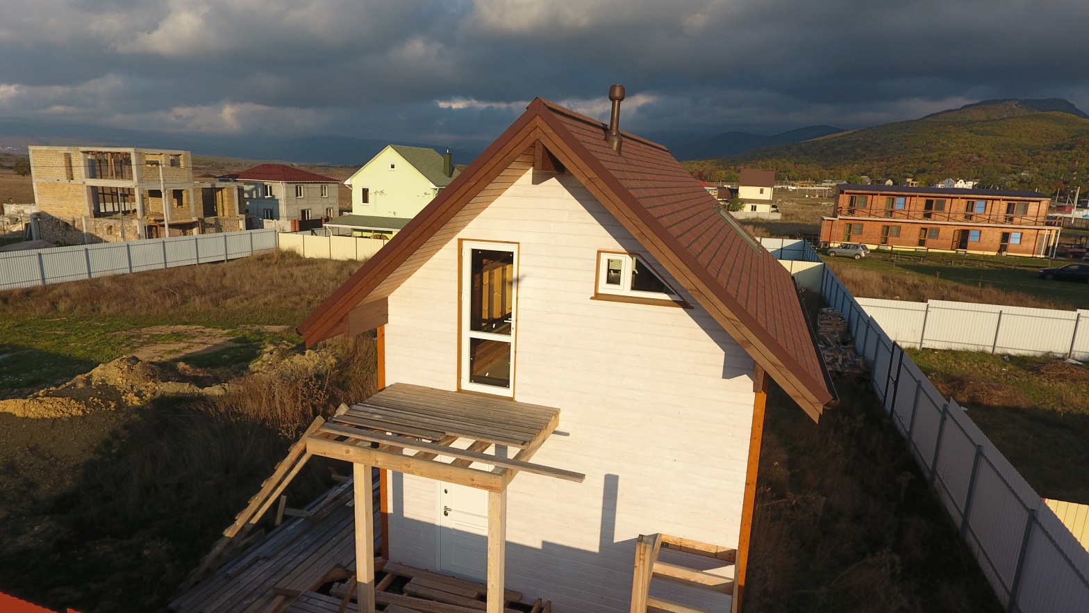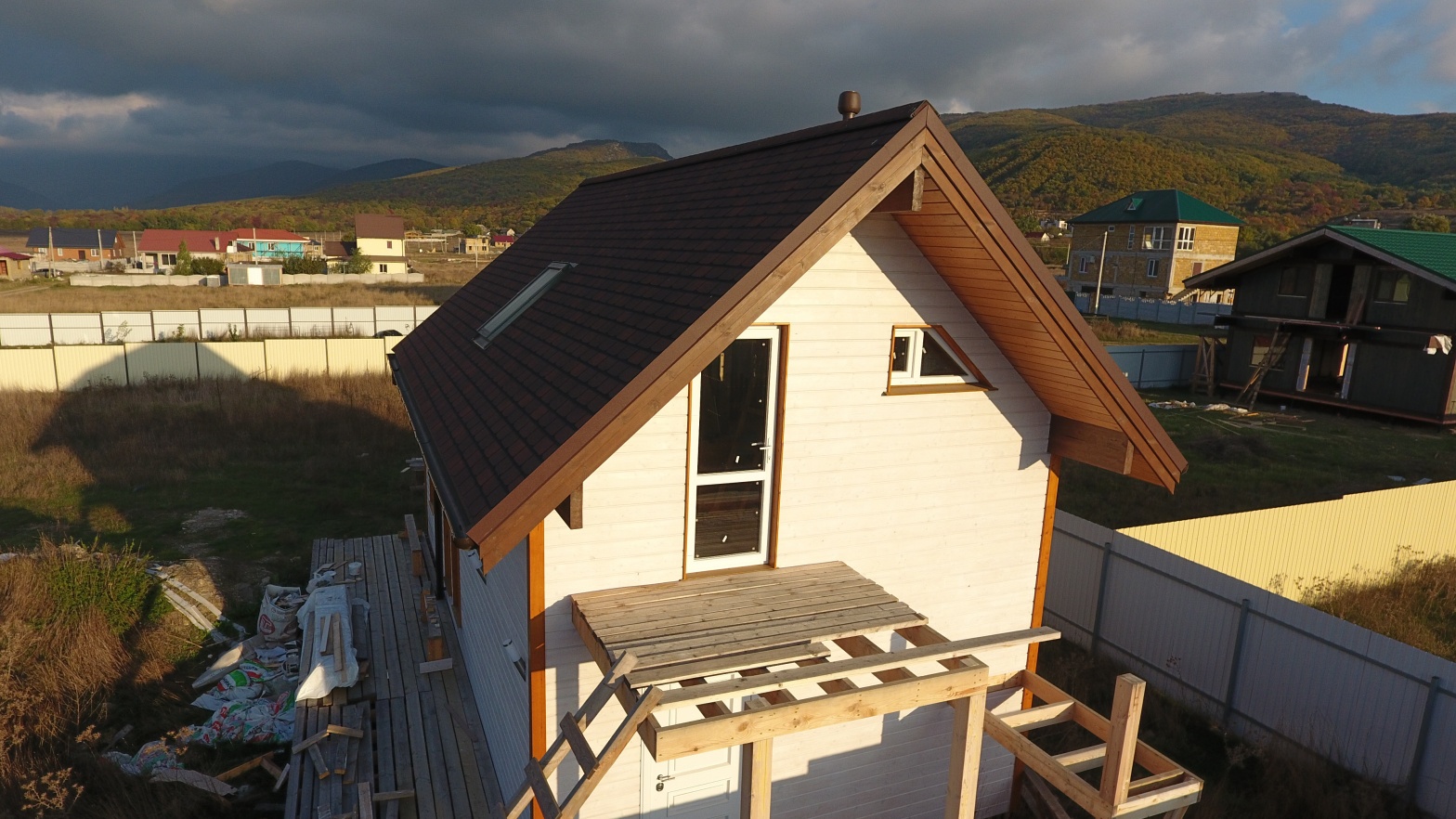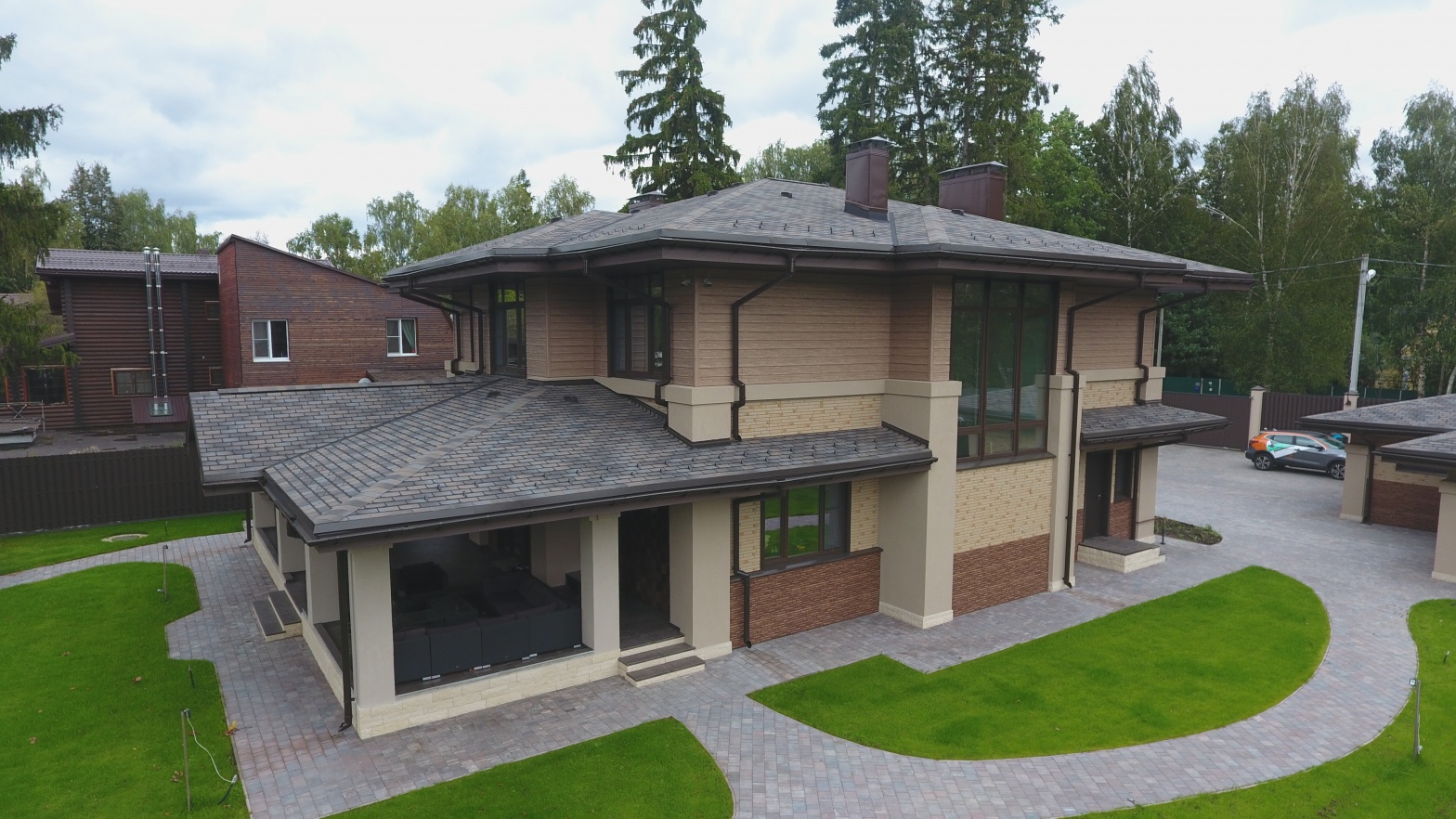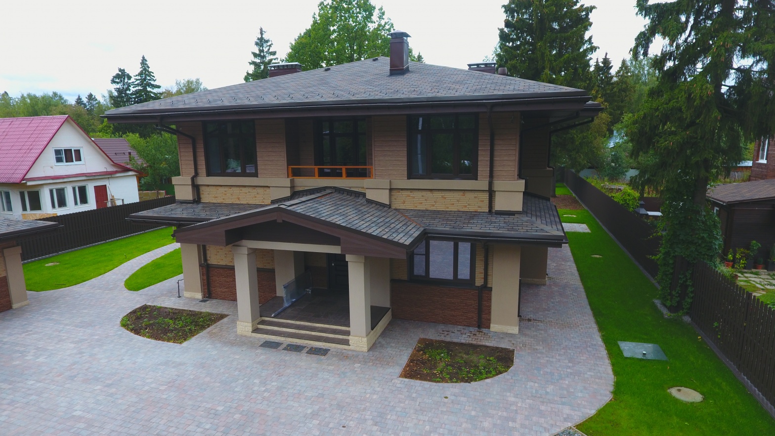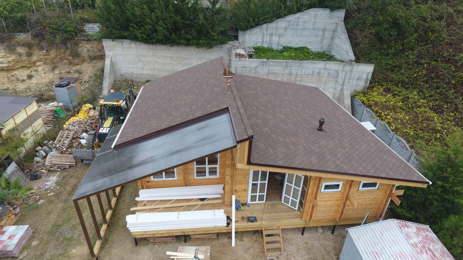 Сайдинг LUX Блок-хаус D4.7T Кедр, Фасадные панели Stein Темный орех, Водосток LUX Пломбир