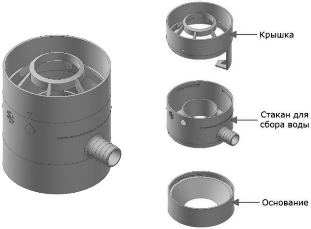 Водосборник универсальный Döcke (далее – «изделие») служит для отведения дождевой воды из водосточной трубы в ёмкость с целью дальнейшего использования для хозяйственных нужд. Состоит из крышки, стакана для сбора воды и основания.