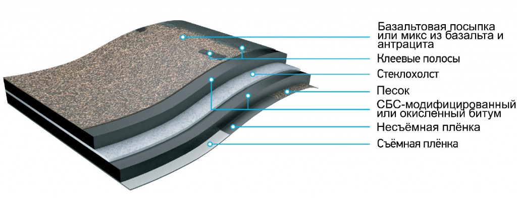 • основа — нетканый стеклохолст. С одной стороны, он должен обеспечивать гонтам необходимую прочность, а с другой — быть достаточно мягким, чтобы хорошо впитывать битум, которым его покрывают с двух сторон. Оптимальную плотность стеклохолста подбирают на производстве исходя из необходимости выполнения двух указанных условий;