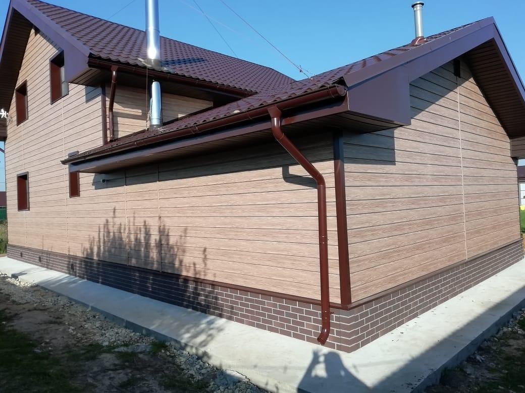 Темные и сочные оттенки сайдинга под кедр хорошо сочетаются с шоколадными водостоками, темными коллекциями цокольных панелей и мягкой кровлей серых или коричневых тонов. Для отделки углов и оконных проемов поставляются аксессуары в основной цвет панелей.